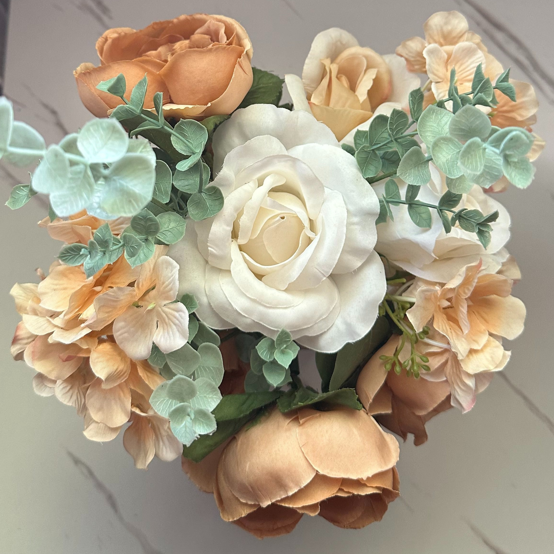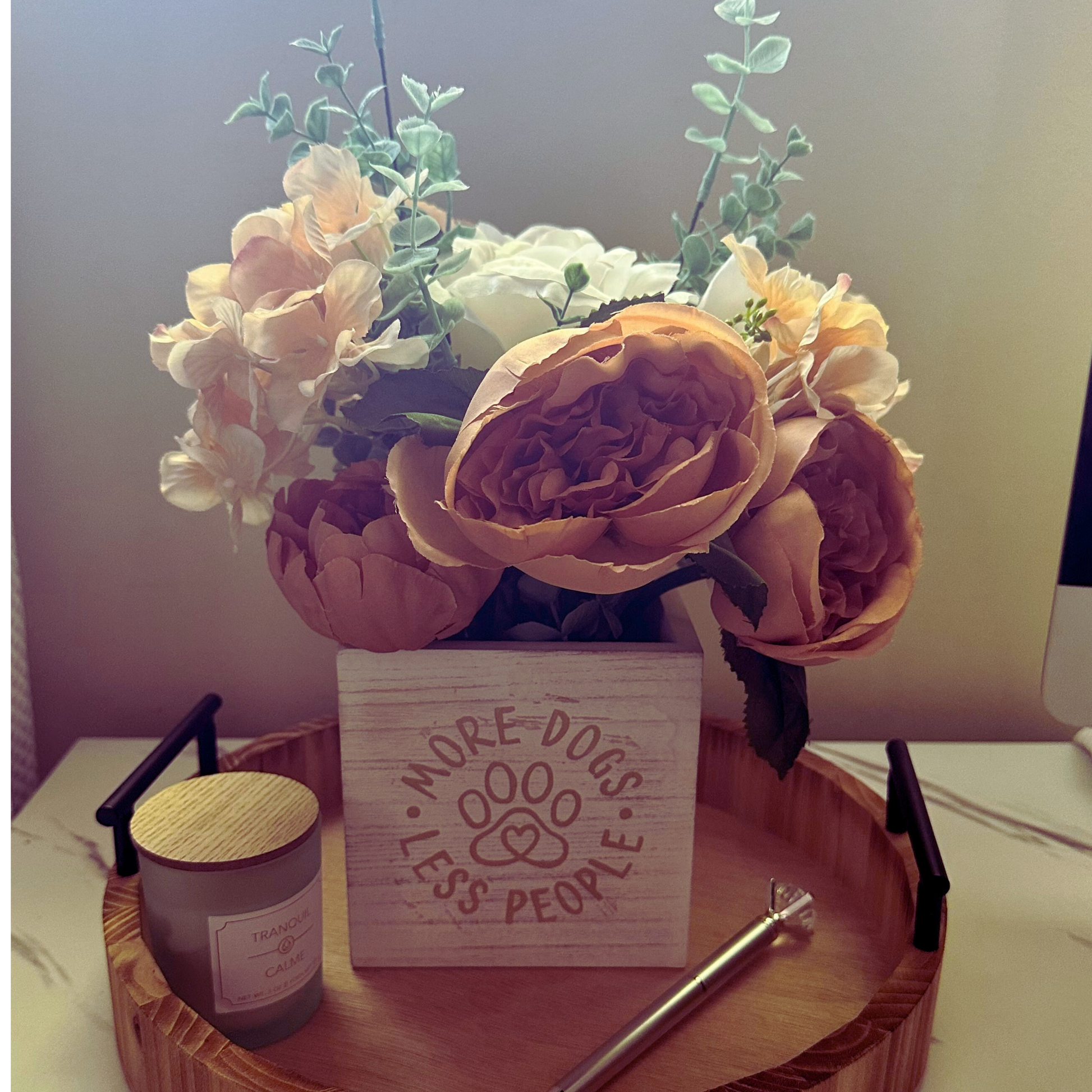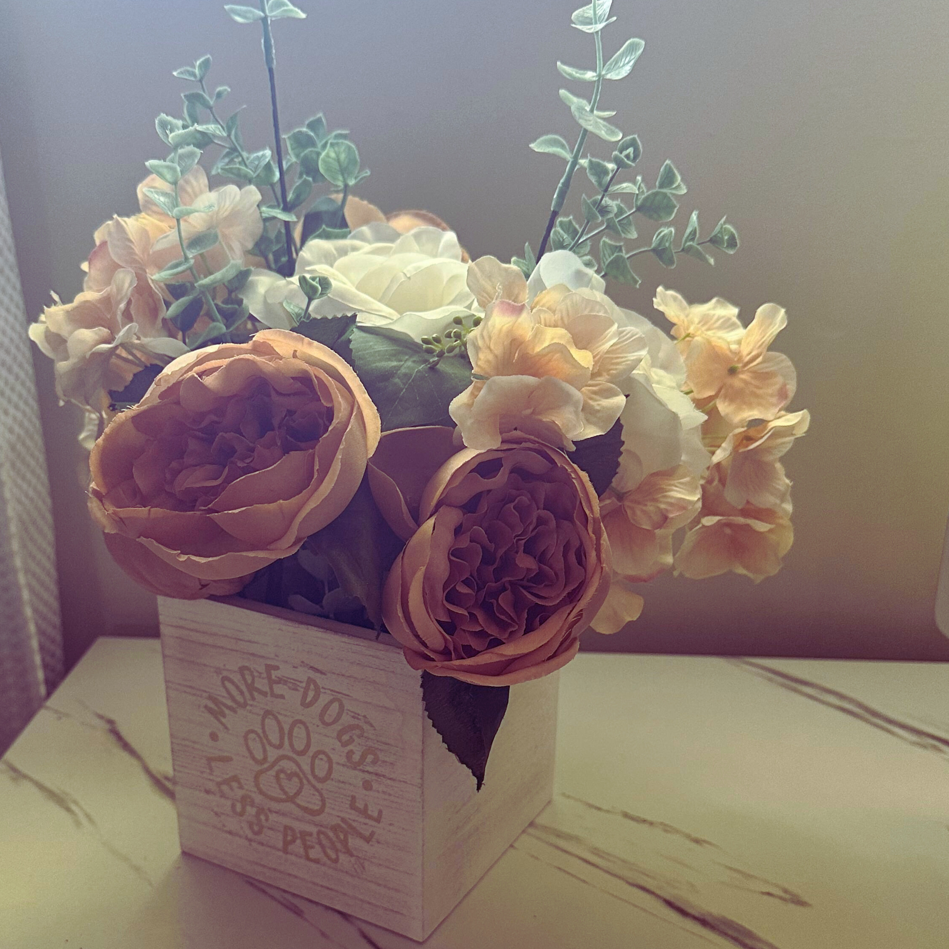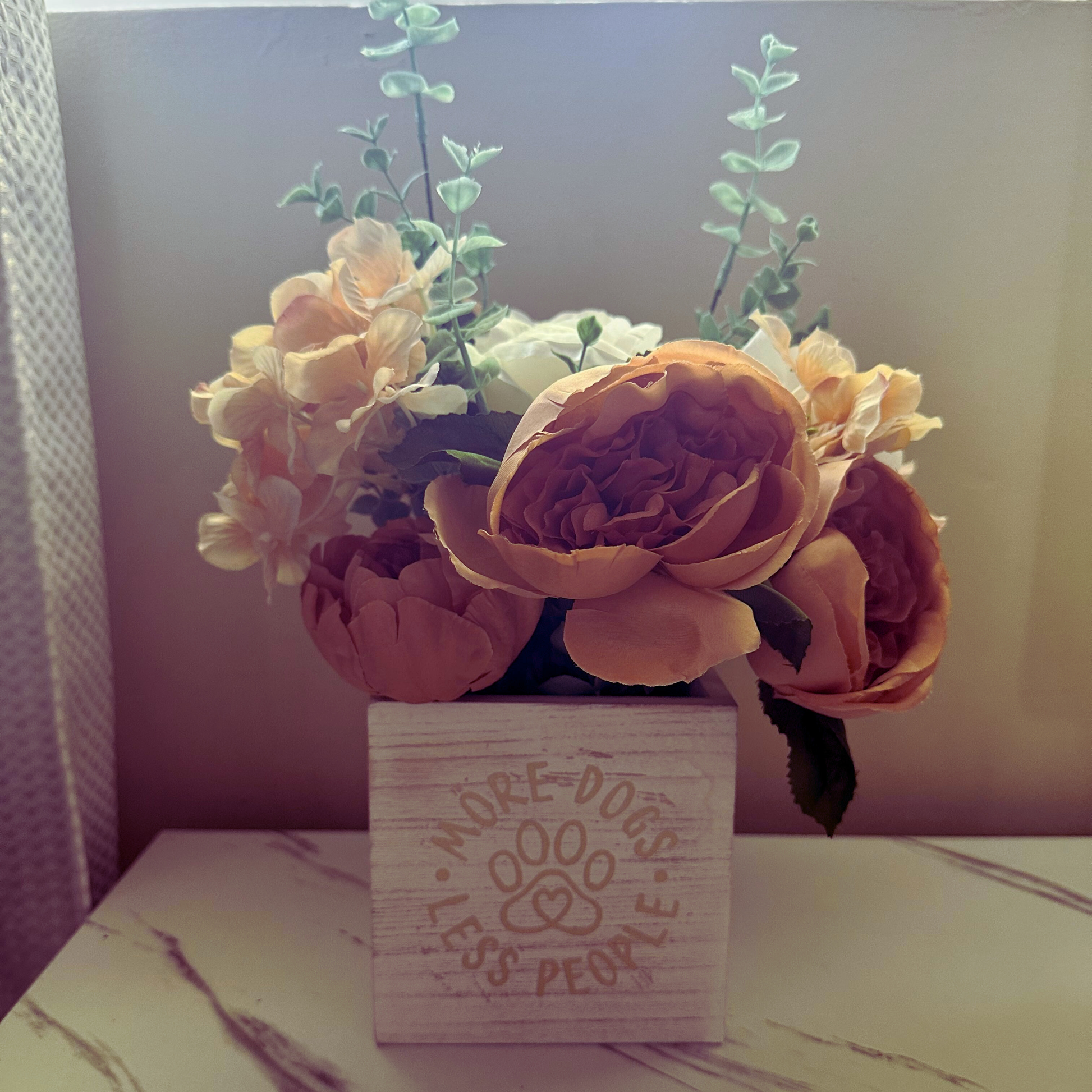 A playful nod to dog lovers everywhere 🐾 This peach-and-cream floral arrangement sits in a rustic wooden box with the words “More Dogs, Less People.” A charming centerpiece or gift with personality.